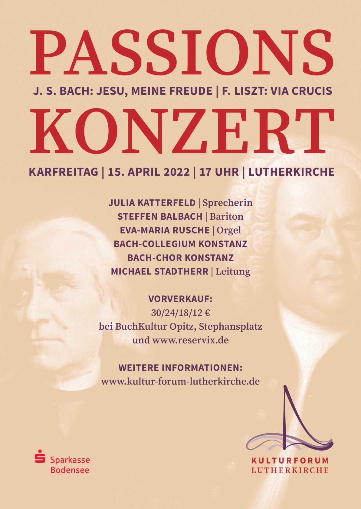 Musikwelt, sind die 14 Kreuzwegstationen vertont, teilweise als Sätze für Orgel solo, teilweise mit Chor- und Solistenbeteiligung. Die einzelnen Stationen werden von Sprecherin Julia Katterfeld mit gesprochenen Meditationen ergänzt. Weitere Ausführende sind der Bass-Bariton Steffen Balbach, Eva-Maria Rusche an der großen Vier-Orgel der Lutherkirche sowie das Bach-Collegium Konstanz auf historischen Instrumenten. Die Gesamtleitung liegt bei Bezirkskantor Michael Stadtherr. Karten im Vorverkauf sind unter www.reservix.de sowie bei BuchKultur Opitz am Stephansplatz erhältlich.